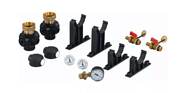 Conține: 2x suporţi scurţi, 2x suporţi lungi, 2x robineţi de umplere/golire, 2x termometre 0 – 60°C, 1x manometru, 2x piese de capăt, 2x racorduri cu olandez, 1x set montaj: 8x şuruburi 6x60mm, 8x cleme plastic 8x40mm, 2x garnituri 44x32x2